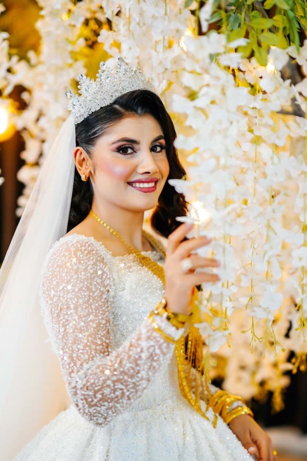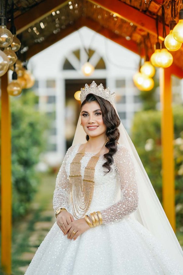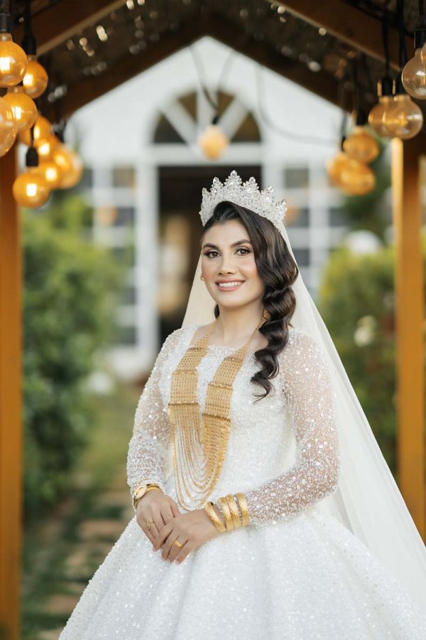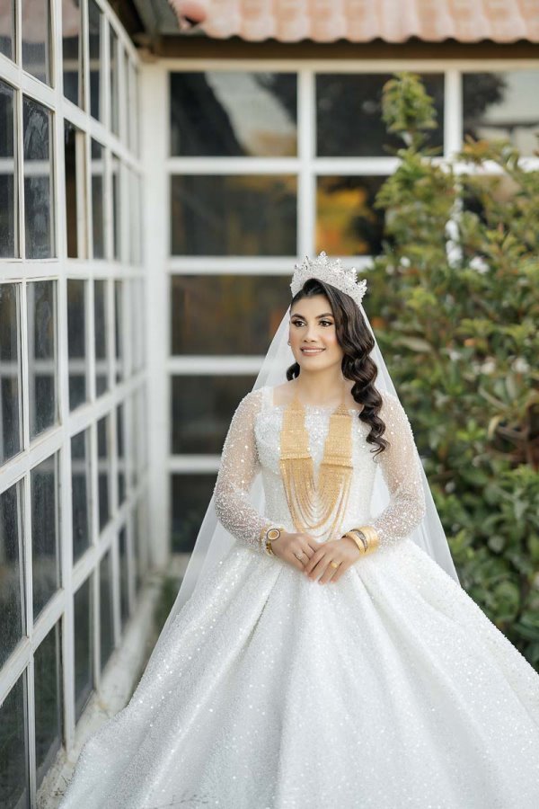 Bahar, göz kamaştıran ışıltılı gelinliğiyle zarafetin sembolüydü. Başındaki taç, bir masal prensesini andırıyordu.